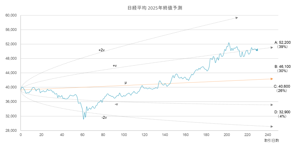 2025年1月1日に予測した日経平均2025年終値に向かう動きをモニターしています。