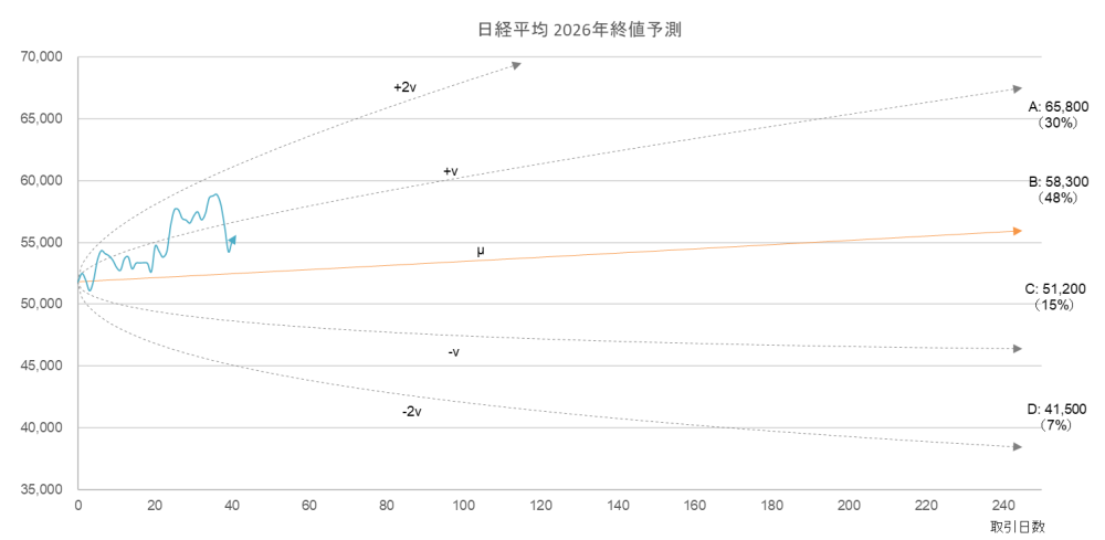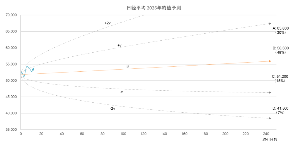 右端の A~D が過去76年間の実績に基づく移行パターンから導いた 2026年の終値予測とその到達確率。