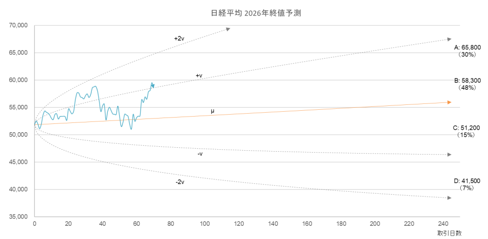 右端の A~D が過去76年間の実績に基づく移行パターンから導いた 2026年の終値予測とその到達確率。